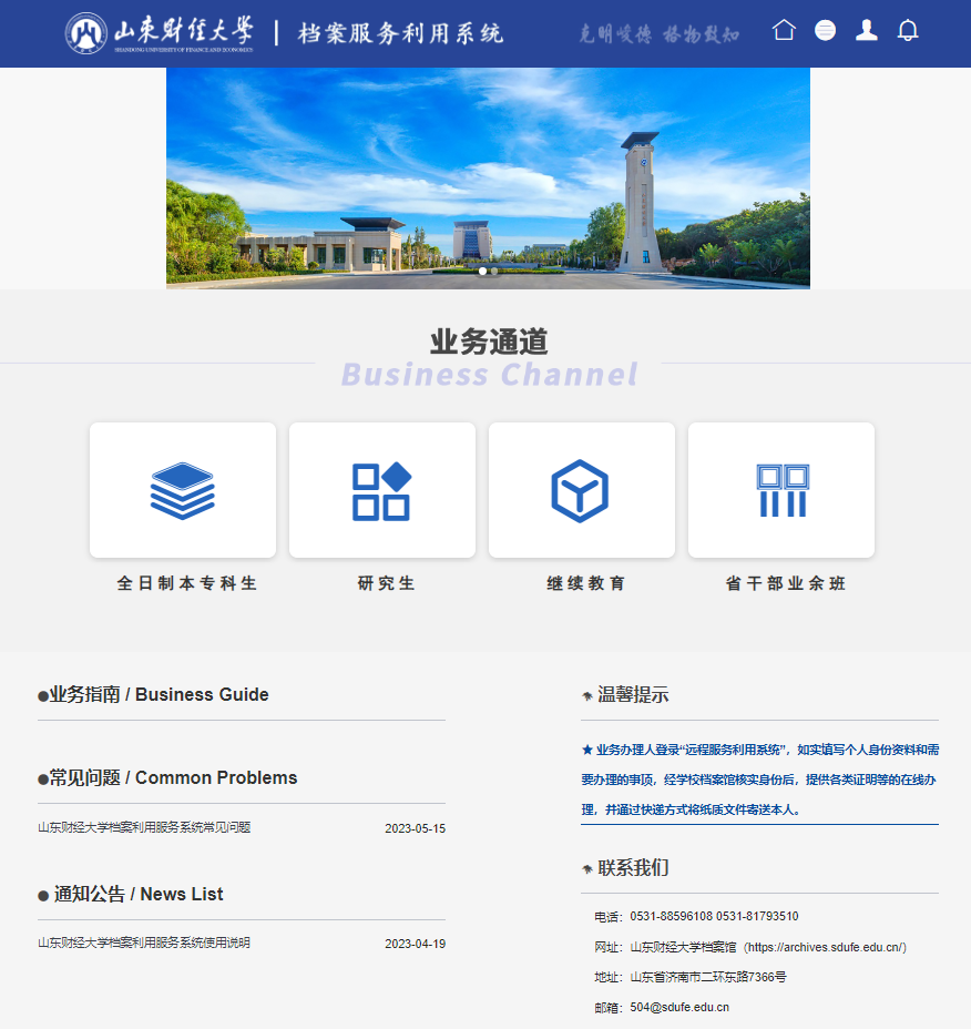 2023年6月9日是第16個國際檔案日,今年國際檔案日系列宣傳活動的主題為“奮進新征程?蘭臺譜新篇”。為響應活動安排,提升檔案服務利用水平,方便已畢業校友查詢利用檔案資源,檔案館(校史辦公室)聯合就業指導處、合作發展處(校友工作辦公室)開通了山東財經大學學籍檔案查詢服務系統,提供在線“一站式”學籍檔案查詢及相關證明的遠程預約辦理服務。