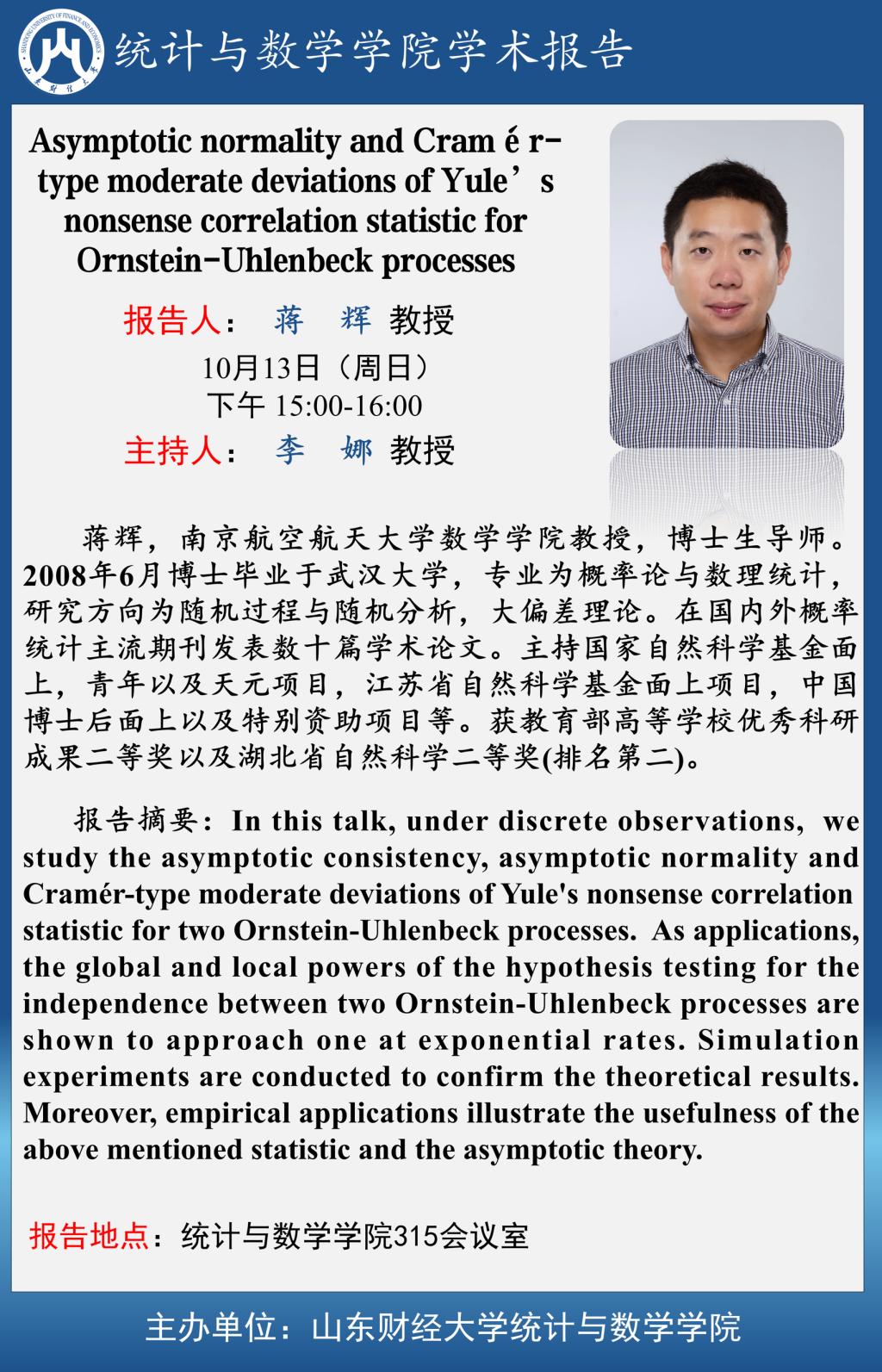 統計與數學學院學術報告—Asymptotic normality and Cram\'{e}r-type moderate deviations of Yule's nonsense correlation statistic for Ornstein-Uhlenbeck processes