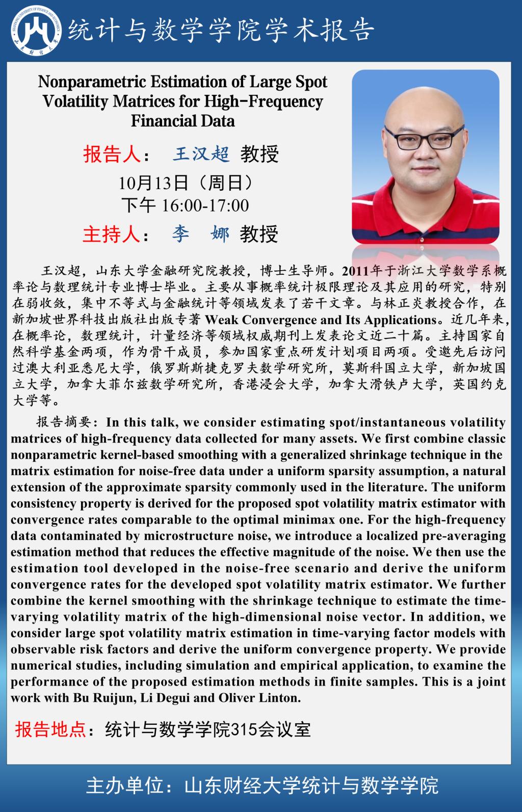 統計與數學學院學術報告—Nonparametric Estimation of Large Spot Volatility Matrices for High-Frequency Financial Data