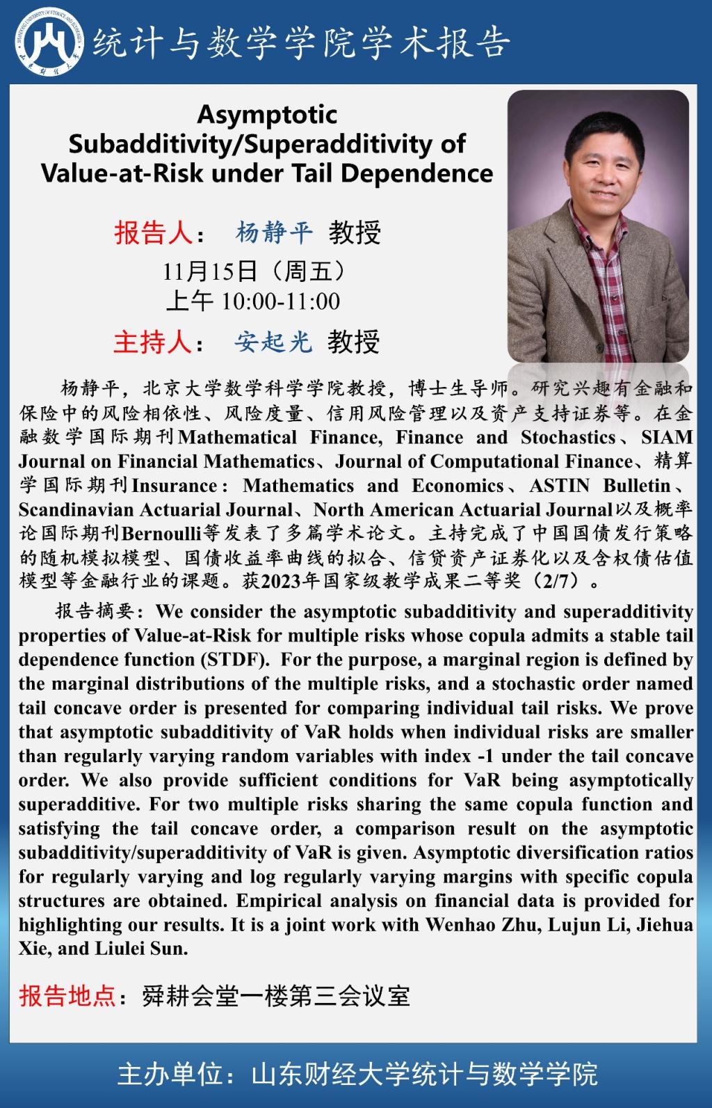 統(tǒng)計與數(shù)學(xué)學(xué)院學(xué)術(shù)預(yù)告—Asymptotic Subadditivity/Superadditivity of Value-at-Risk under Tail Dependence